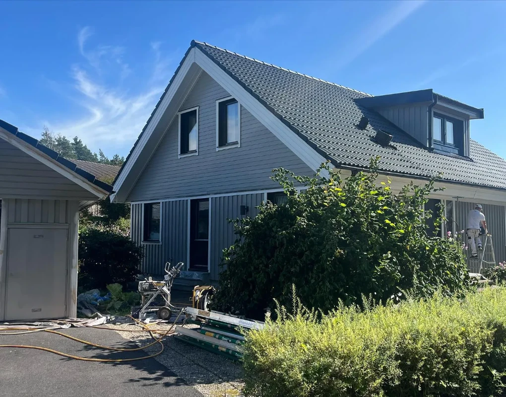 Vi börjar alltid med en grundlig rengöring av takpannorna för att avlägsna smuts och mossa. Detta steg är avgörande för att färgen ska fästa ordentligt och ge ett jämnt resultat.